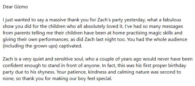 Gizmo offers sweet and chocolatey children's shows and parties that will delight and amaze your guests of all ages.